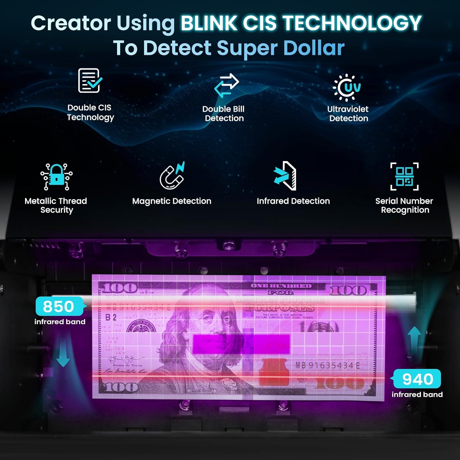 • Superior Counterfeit Detection: Using Blink CIS technology, the VS75 money counter has enhanced counterfeit detection capabilities that can detect bills under both 850 mm and 940 mm Dual Frequency Infrared Light. It also uses additional detection methods such as UV, MG, IR, MT, Security Line Variable Ink and Serial Number Reading for USD, EUR, GBP, CAD, MXN, to ensure reliable counterfeit detection