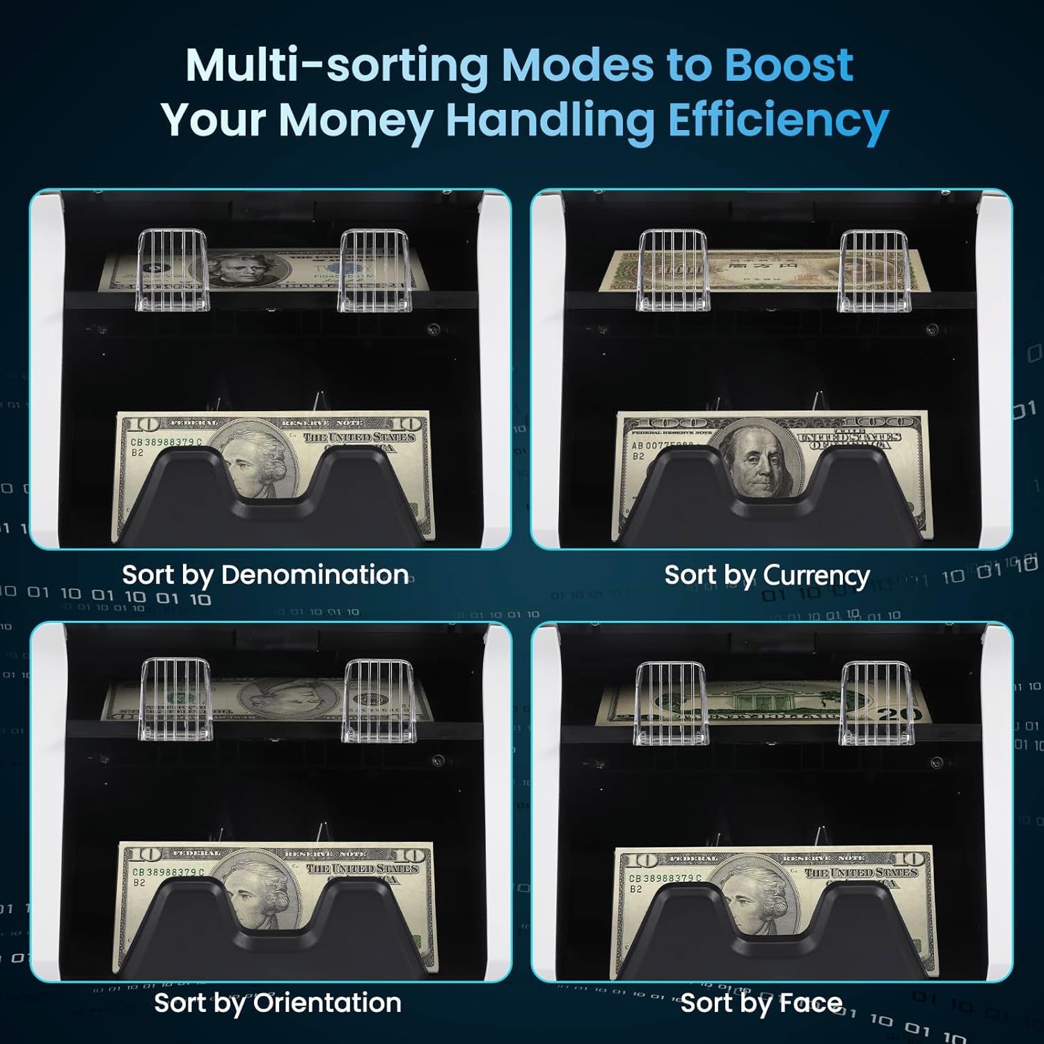 • Effortless Money Sorting: The VS75 is a plug and play bill sorter with two pockets and a reject pocket. It effortlessly sorts banknotes by face, orientation, denomination, currency allowing for a continuous count with no interruptions. The machine also features a 4-inch TFT touch screen that minimizes the need for key buttons