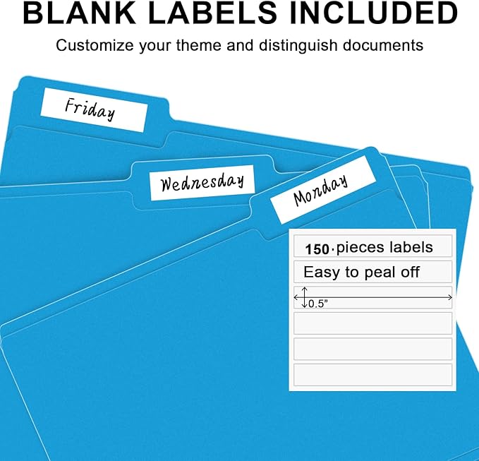 • PACKAGE INCLUDED: This bulk pack includes 150 letter size file folders (50 of each position) and 150 blank labels, ideal for any home, office, or school project, providing you with plenty of storage space for all of your important documents