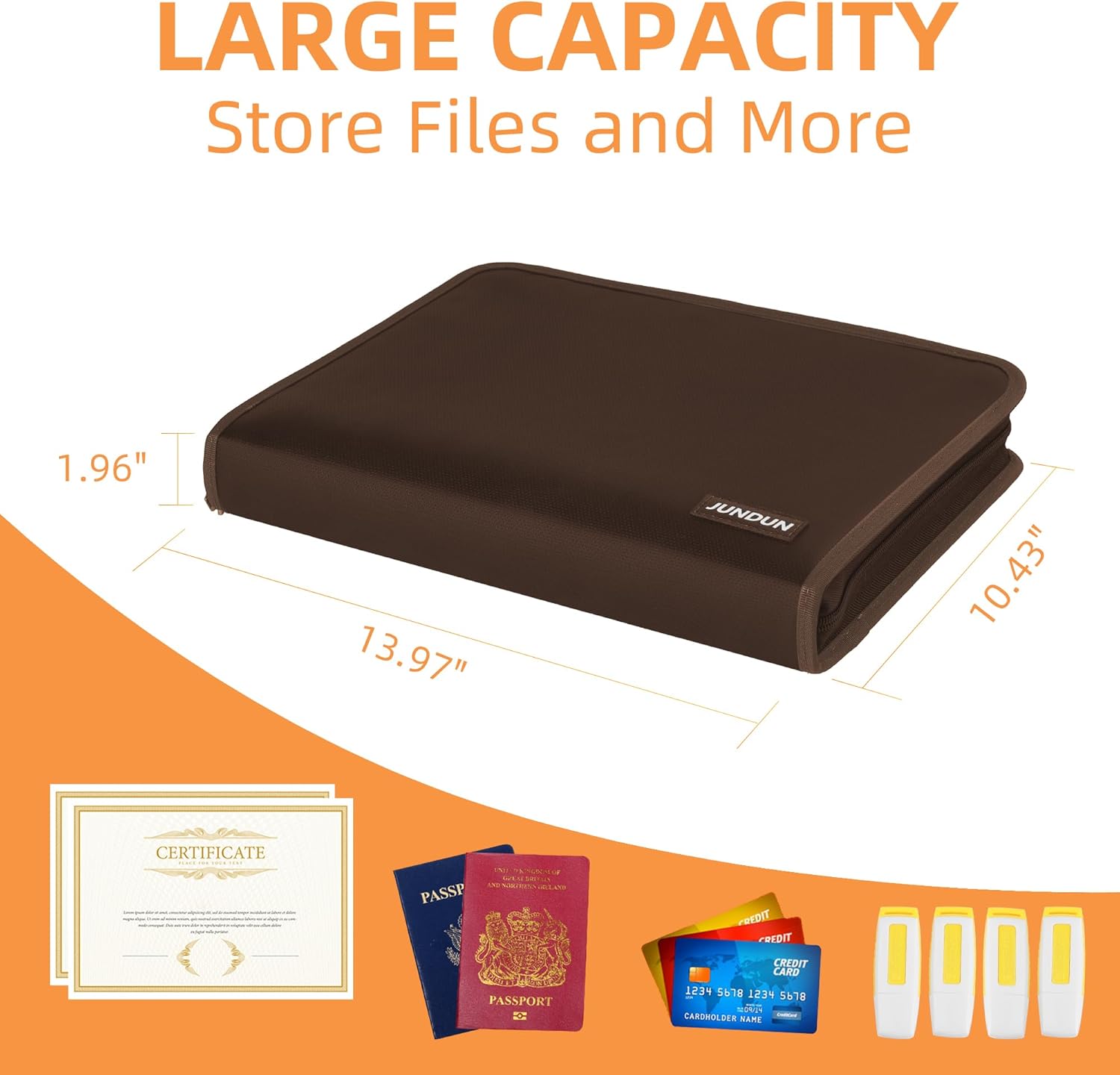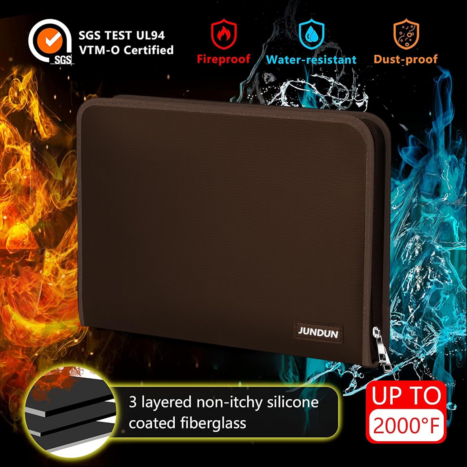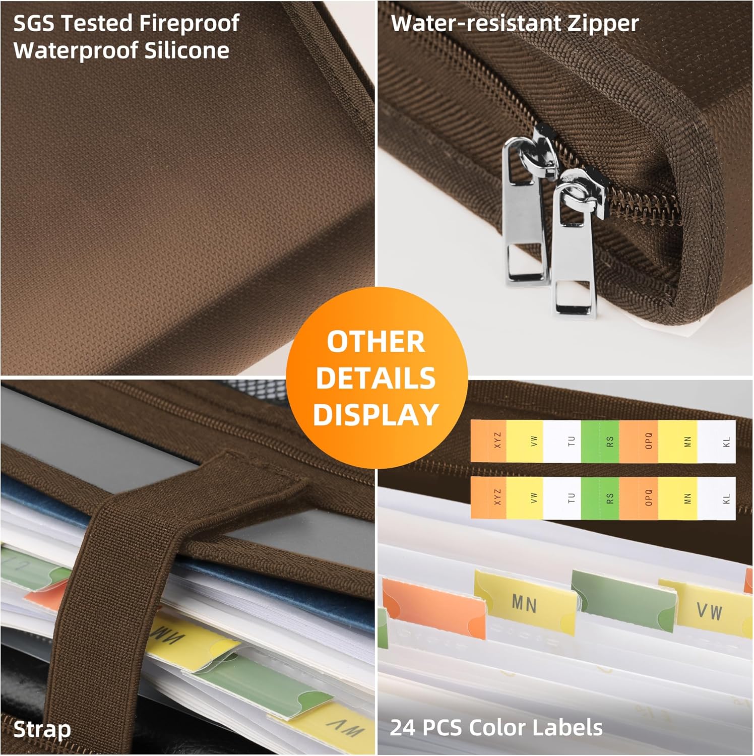 • HIGH-QUALITY MATERIALS: Protect your documents with our fireproof accordion file organizer.Made of double-layered,non-itchy,silicone-coated fiberglass,it can withstand up to 2000℉ and has passed the SGS Test (UL94 VTM-0 Certified). Highly water-resistant,it's the perfect solution for unexpected spills or accidents.Keep your files organized and easily accessible with our expanding file organizer.Invest in added protection today!