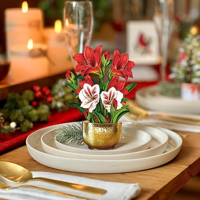 • SCARLET AMARYLLIS BOUQUET unfold in your hand to reveal a joyful artificial flower bouquet in a golden pot. Comes with blank note card that is the perfect gift card holder for birthdays, anniversaries or everyday.