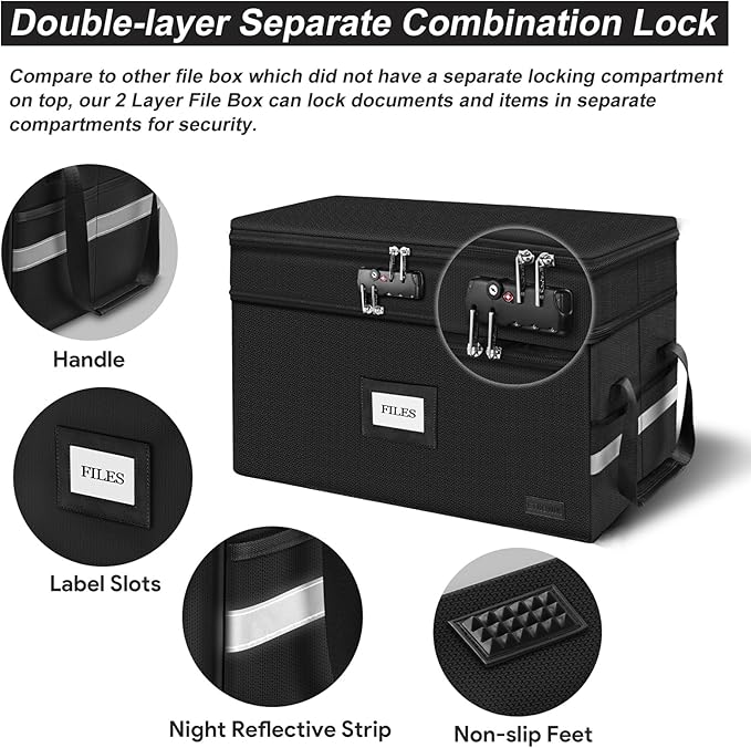 • [Combination Lock Protection] Compared to other file cabinet which did not have a separate locking compartment on top, our 2 Layer File Box can lock documents and items in separate compartments for security. High-quality password lock provides maximum security for your valuables such as contracts, cards, certificates, conference materials, passports, etc. The package includes an instruction manual for a combination lock. The double zipper design makes it easier to open and close. No keys required
