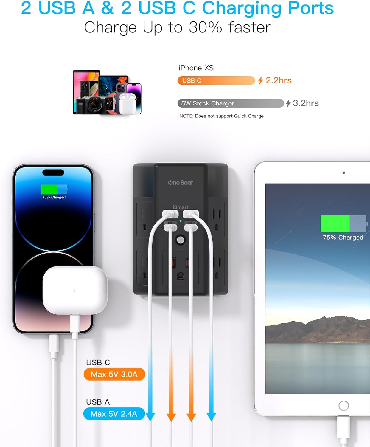 • 【Multi Plug Wall Outlet 】- The plug extender total output of 4 USB ports is 5V/3.1A. Built in smart technology, the multi plug outlet can auto-detect charged devices and deliver optimum charging speed up to 5V/2.4A (max) each port, USB-C up to 3A.( Please note The UCB-C port is not Quick Charger 3.0, doesn't support any other devices which need 9~22V charging voltage.)