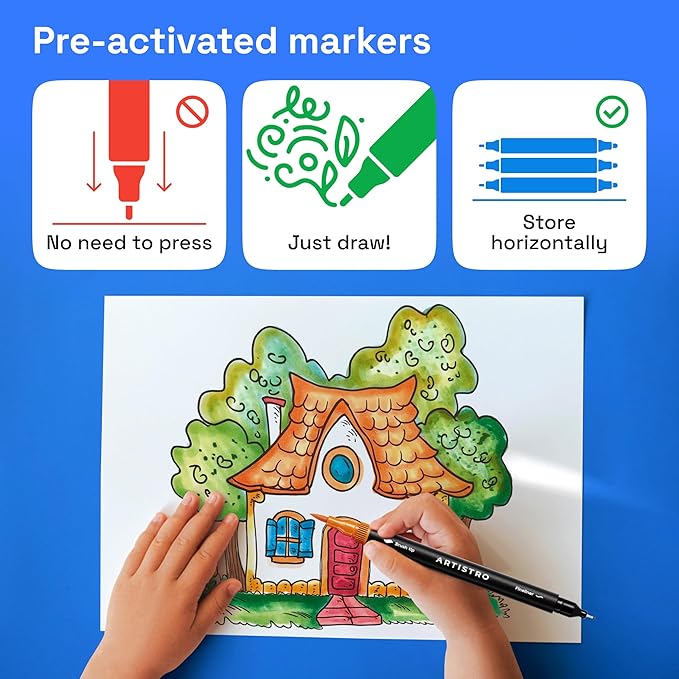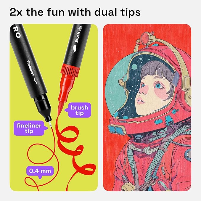 • BRUSH & FINE POINT PENS: Explore endless opportunities with these dual-ended drawing pens. You get 2-in-1 art pens that are both 0.4 mm fine tip pens and dual brush marker pens. These coloring markers are perfect for doodling, coloring, writing, and coloring books.