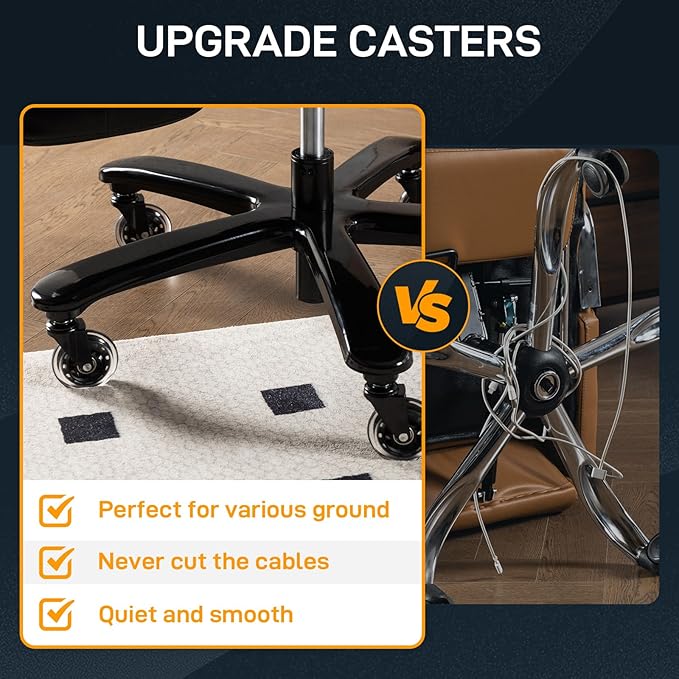 • 【Upgrade Bearing PU Casters】Compare to plastic casters, this chair equipped with 360 swivel rubber casters. The casters are more aesthetics, quieter and smoother. Perfect for wood floors, carpet, or tile, they won't affect your coworkers at work or your sleeping baby.