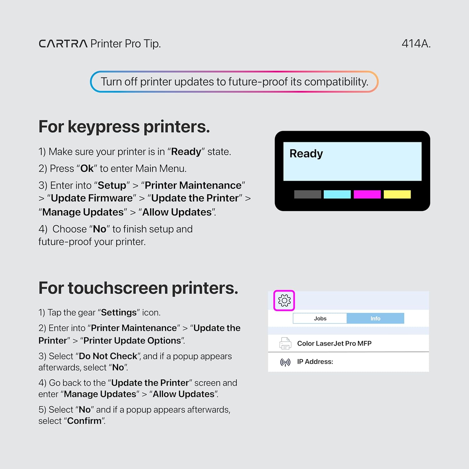 • High page yield & quality: Print up to 2,400 black and white pages and 2,100 color pages without compromise. Our 414A cartridges deliver consistent, high-quality prints without fading, streaking, or leaking, backed by our Cartra Page Yield Promise.