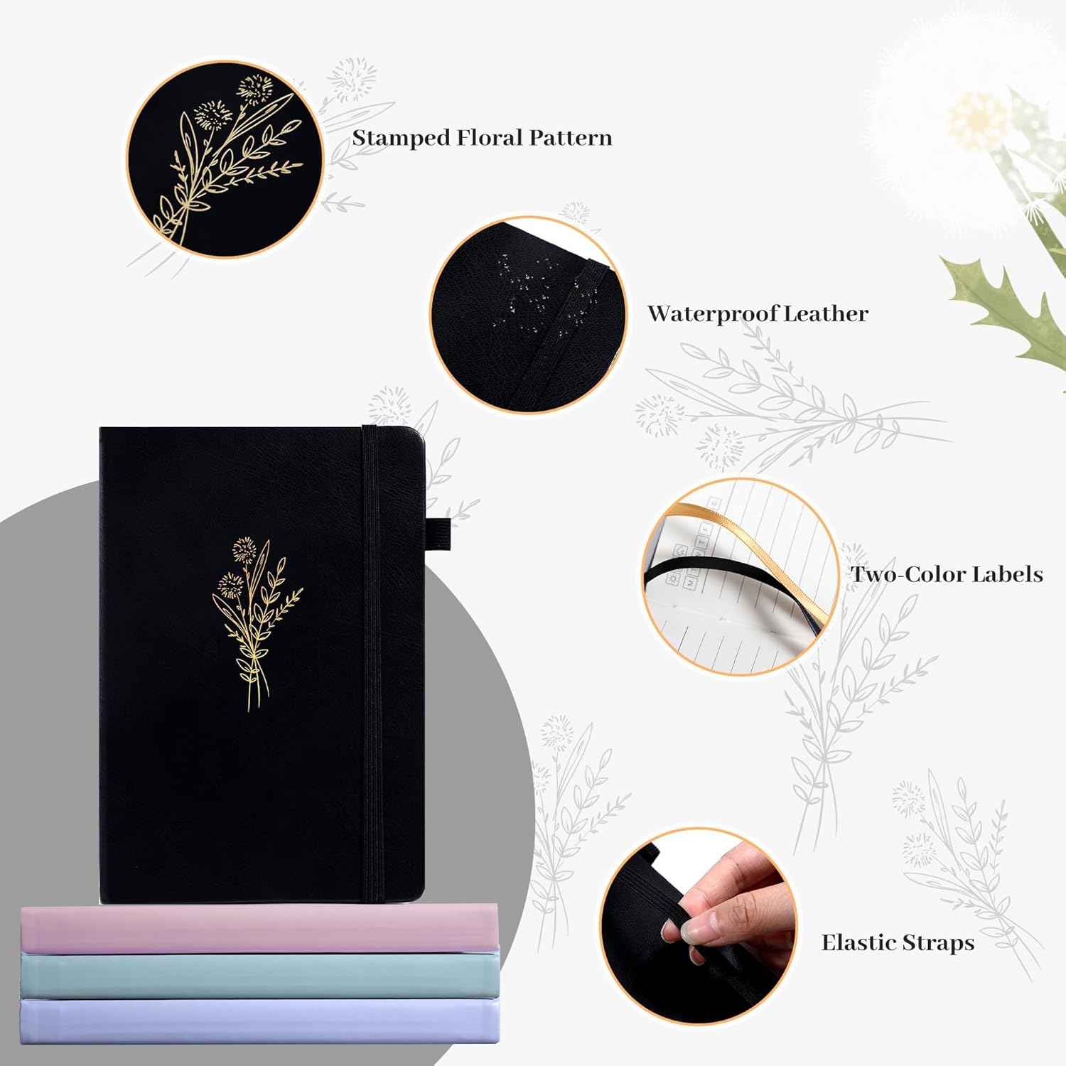 Lined Journal Notebook for Women Cute Leather Journals for Writing Aesthetic Floral Diary 192 Pages A5 Hardcover Journaling Notebooks with Pen Loop, 5.7 x 8.3 In, Black