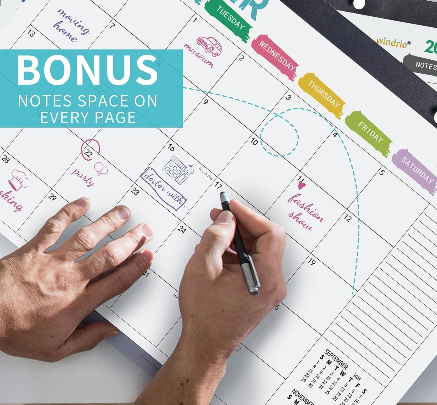 • Effortless Organization and Abundant Writing Space: Effortlessly organize your schedule and never forget important details with our spacious 17" x 12" desk calendar, which provides ample writing space in generously sized daily grid blocks and dedicated monthly note columns for jotting down additional information, goals, or ideas while keeping your schedule neat and organized, complete with holidays and important dates for your convenience.