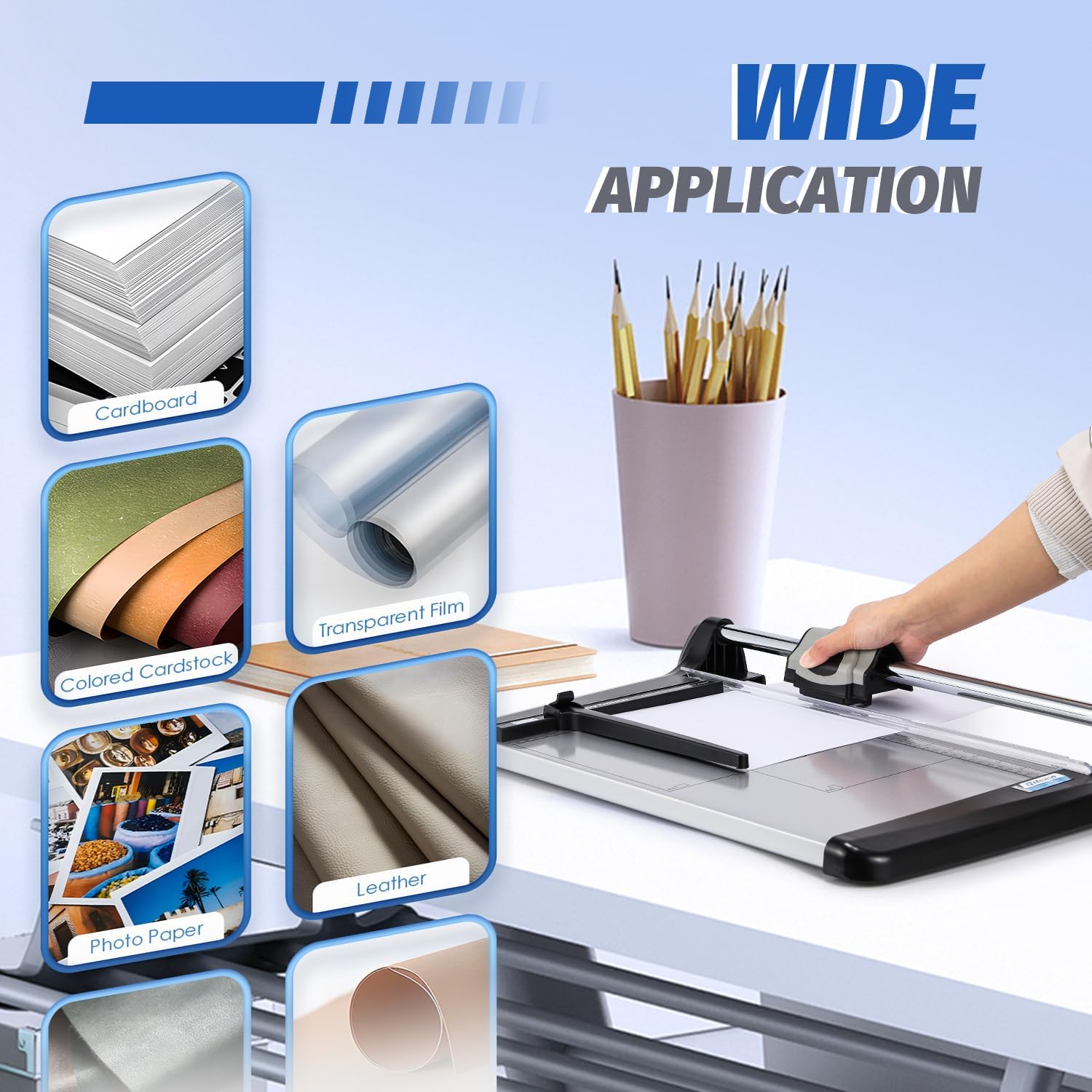 • 360mm(14.47") Cutting Length---This cutter can handle up to 360mm of material, which is about 14.17 inches. That's longer than the longest edge of a normal A4 sheet of paper. It's great for most cutting needs and is ideal for photo studios or drawing cutting.