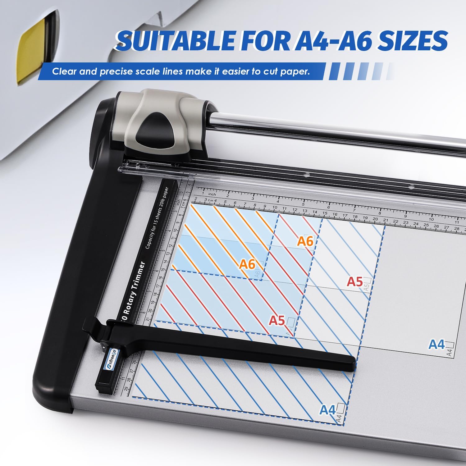• 15 Sheets Capacity---This heavy-duty paper cutter can handle up to 15 sheets of plain copy paper, but if you're cutting so many paper, you might need to apply a little force to get it through.