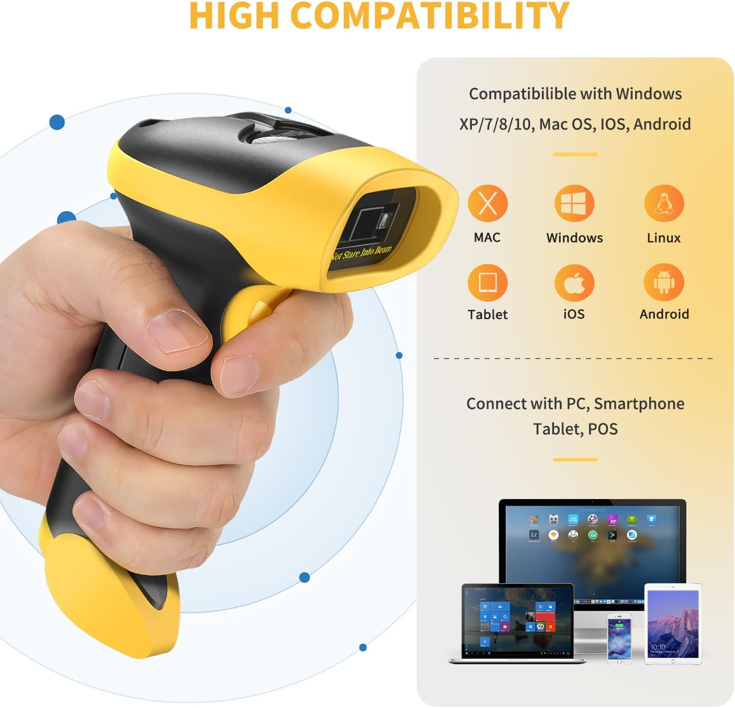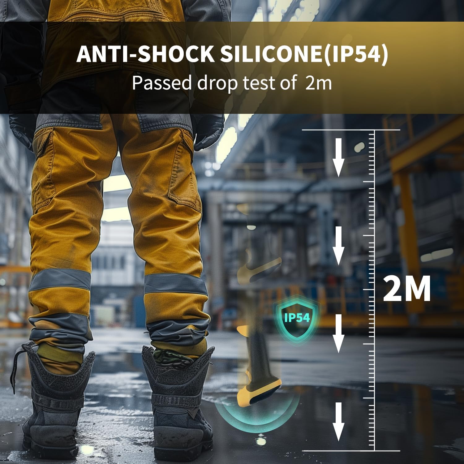 • ➤Professional Anti-Shock Design - Made of great ABS+PC materials,high shock-resistant, and the silicone protective cover can avoid the scratches and friction while falling from the height of 6.57 feet; the technical of IP54 sturdy which protect the wireless barcode scanner from dust and moisture.