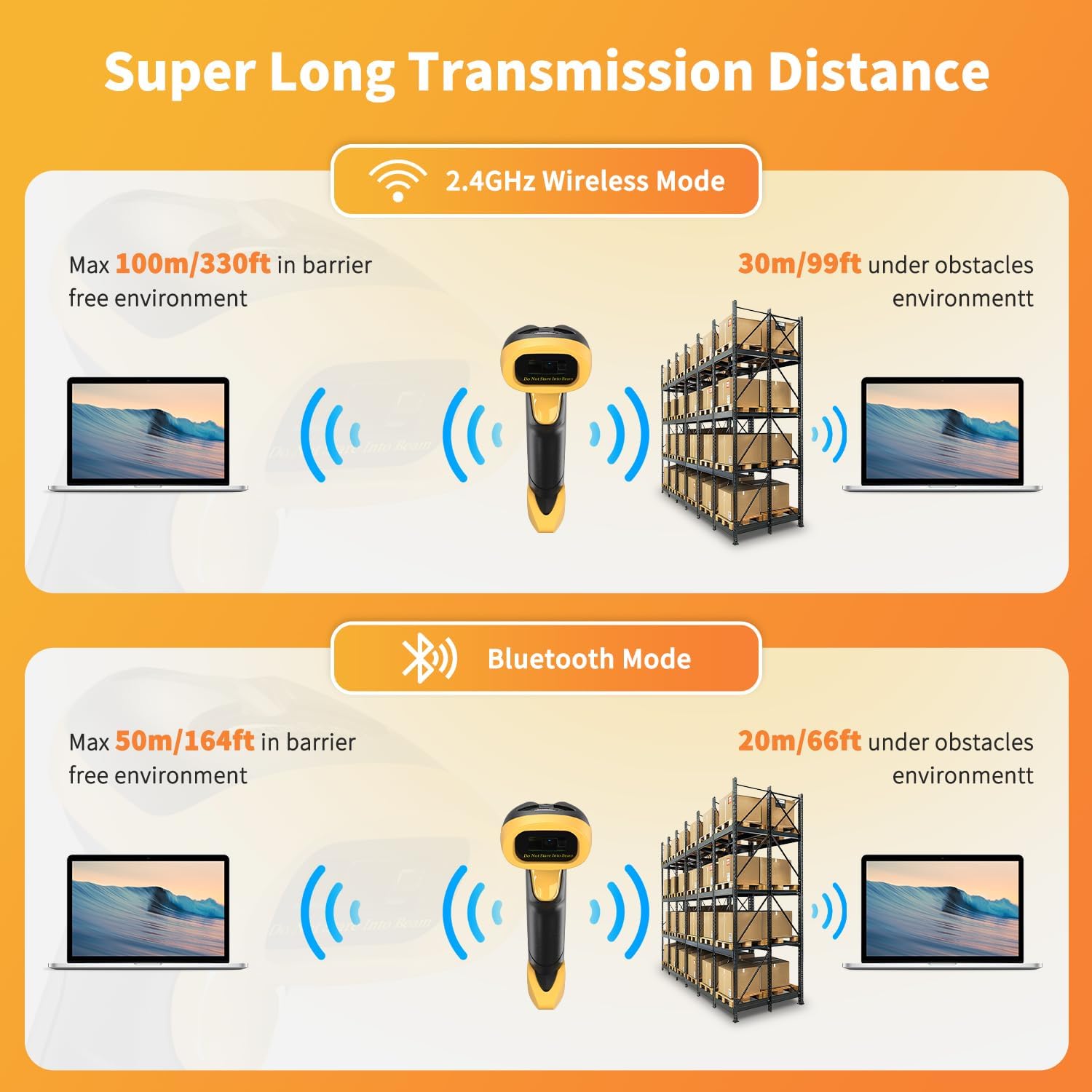 • ➤Auto Scanning & Storage Mode - Manual Scan & Auto-sensing Scan & Continuous Scan. Two working mode: Instant upload mode / storage mode. Scan and store barcodes, then update the data to your device when you come back entering the wireless transmission range. Sometimes the self-sensing scanning function is in the inactive stage, please contact us and be at your service at any time.