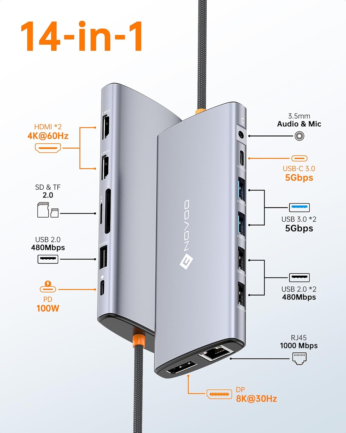 • 💞【14-in-1 USB C Docking Station】NOVOO USB C HDMI multiport hub equipped with 1*DP port, dual 4K HDMI ports, 2*USB A 3.0 ports, 1*Gigabit RJ45 port, 1*USB C PD100W charging port, 1*USB C data transfer port (speeds up to 5Gbps) and 3*USB 2.0 ports, SD/Micro SD card reader and 3.5mm microphone/audio port. Plug and play, no need to install any drivers or software.