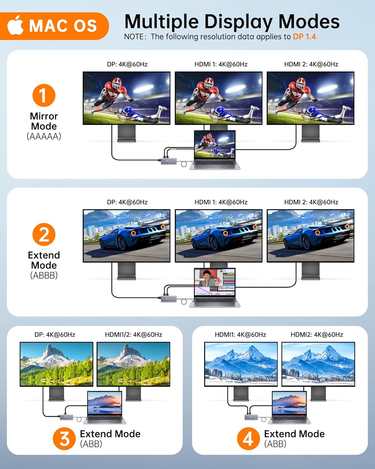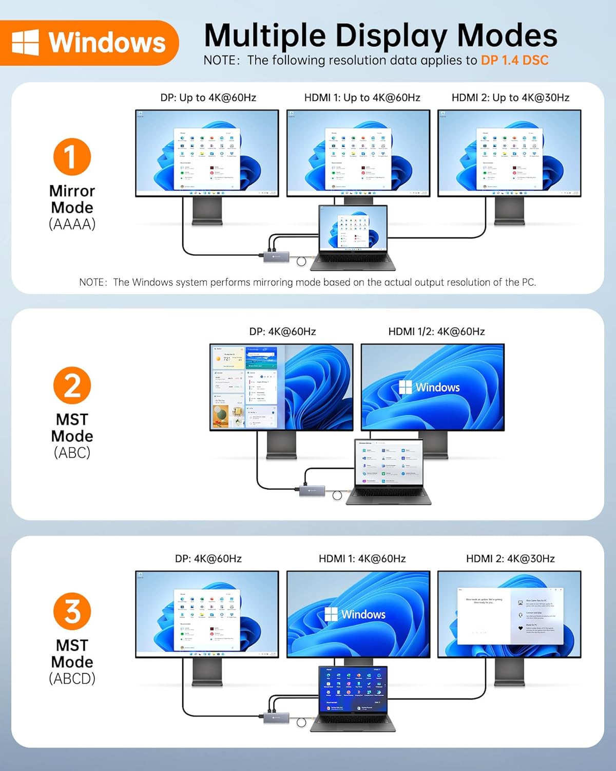 • 📈【Triple Display Made Easy】Perform multitasking work with MST(A-BCD) support. In Windows system, this USB-Hub allows you to display different content on triple 4K@30Hz monitors and easily manage complex projects with spreadsheets, documents and presentations across screens. 🔺Note: macOS only supports mirroring or single extension (A-AAA or A-BBB), not MST multi-monitor support.