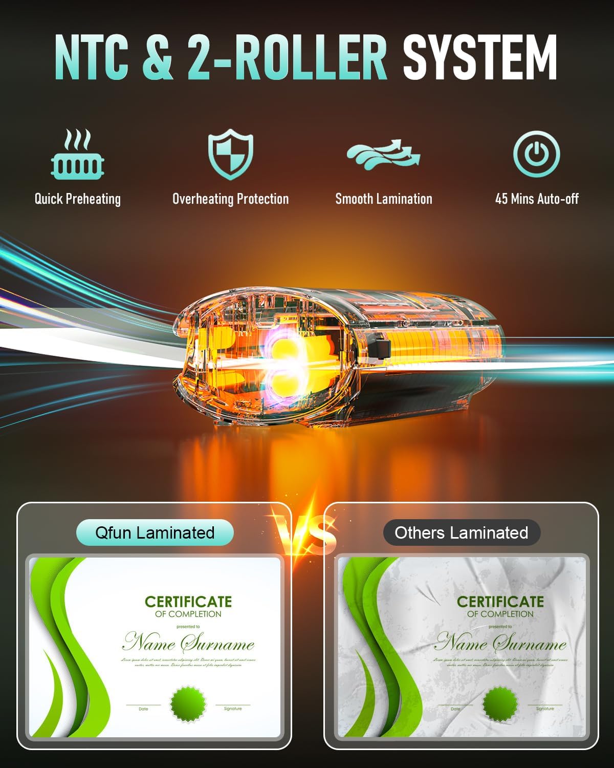 • 60 Seconds Warm-Up For Efficiency: The Qfun laminator machine is ready to start laminating in 60 seconds. Laminating speeds of up to 450mm/minute are up to 70% faster than other models in the industry. This allows your projects to move forward at a rapid pace and dramatically improves work efficiency. No bubbles, no wrinkles, easy to operate, ideal personal laminator for teachers, business person, suitable for saving important documents and precious photos