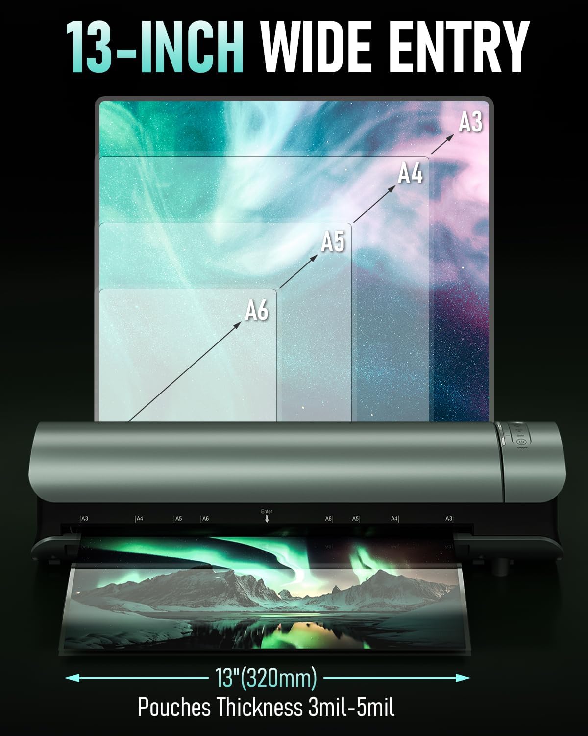 • Portable Laminator Machine 13 Inch Wide: Easily handles a wide range of paper and photo sizes including A3/A4/A5/A6. From documents and training materials to menus, posters, drawings, photos and bookmarks. Simply choose the right film thickness for professional grade laminating results.Tips:It is normal that there may be an odor the first time you use it, and it will gradually disappear after a few uses. (Odor is heated laminate odor, safe and non-toxic)