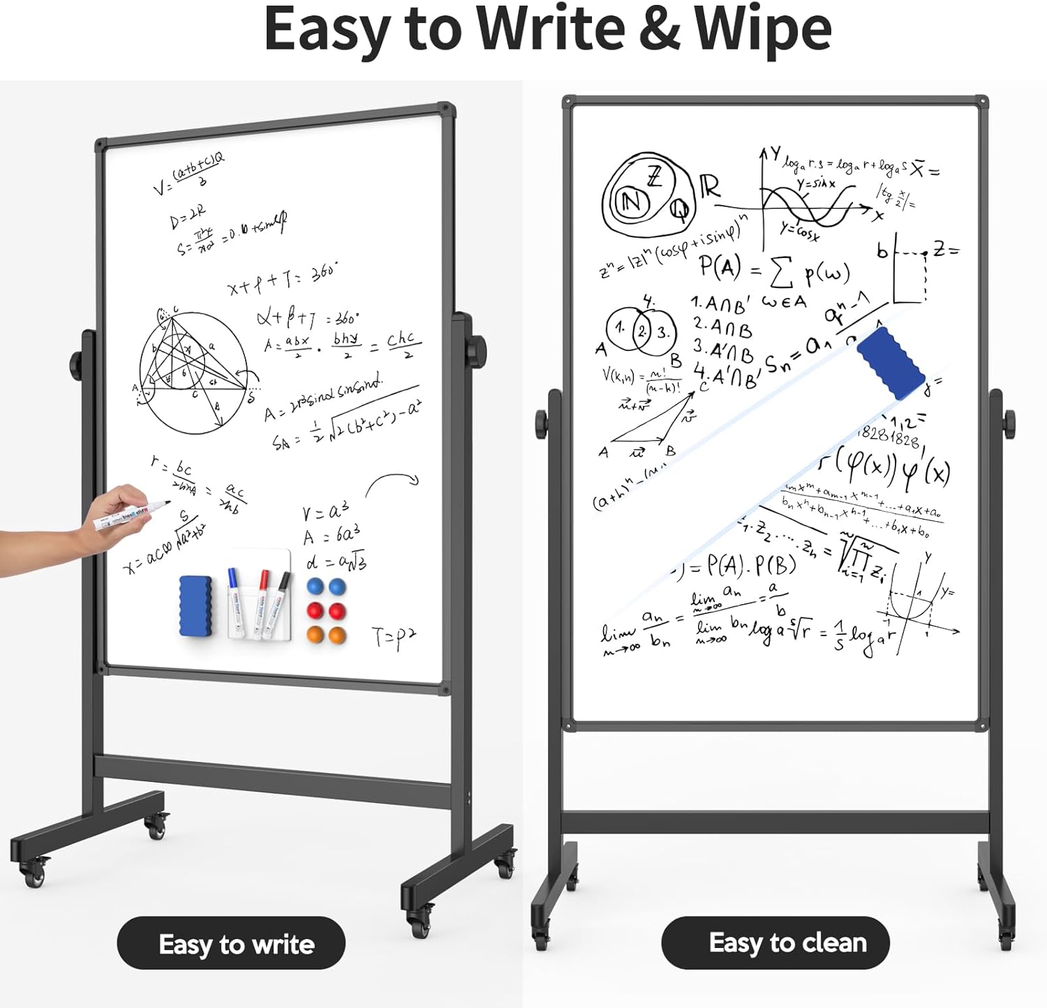 • Spacious Writing Surface with Complete Accessories: Maximize your writing space with our double-sided 48x32-inch whiteboard, offering double the surface area with a quick flip. Includes 3 markers, 6 clasps, 1 eraser board, and a pen holder—everything you need to get started.