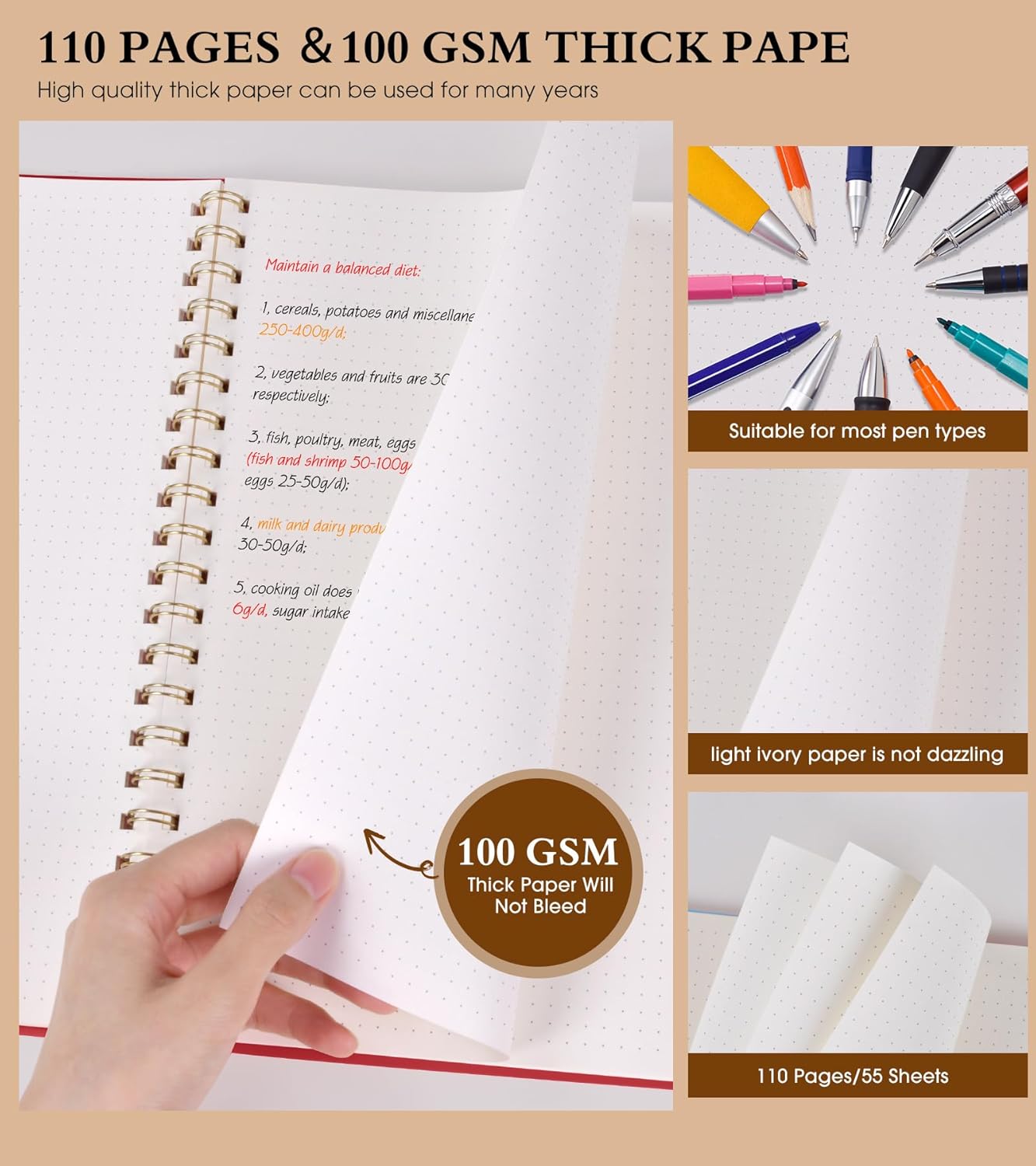 • 【100 GSM Ink-friendly Paper】 Our red spiral dot grid notebook pages are very thick, which avoids ink bleeding through and ghosting. Suitable for most pen types, such as ballpoint pens, fountain pens. Each dotted journal 55 sheets/110 pages, offering enough space to write in. Allowing you to write on both sides of every page to maximize your usable space. light ivory paper is not dazzling, let you have a comfortable writing experience.