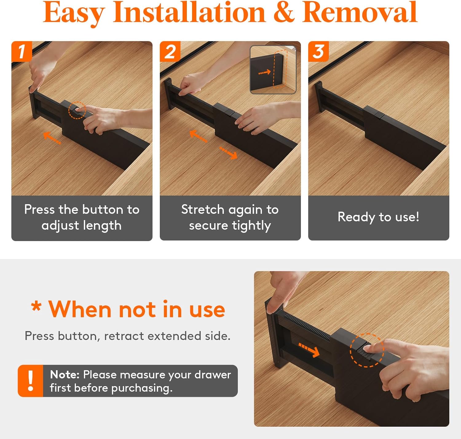 • Easy to Install: To adjust the length, press the top button before placing the drawer organizer, and then stretch it out again to secure it tightly. The strong spring tension keeps each organizer upright and secure. When retracting, press the top button and push in the stretched side.