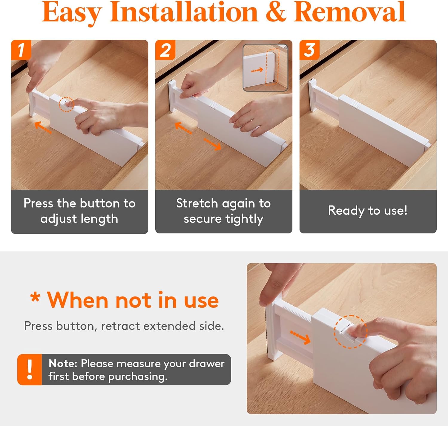 • Easy to Install: To adjust the length, press the top button before placing the drawer organizer, and then stretch it out again to secure it tightly. The strong spring tension keeps each organizer upright and secure. When retracting, press the top button and push in the stretched side.