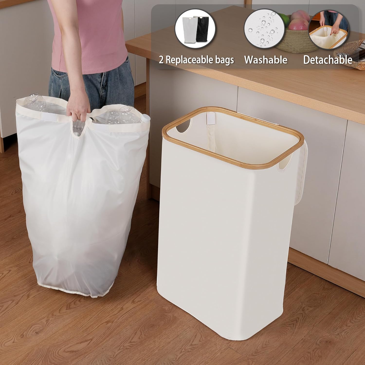 • ♻【Waterproof and Durable】Made of sturdy materials including thickened fabric and bamboo handle, this indoor recycle bins is durable and long-lasting. The thick fabric can accommodate up to 110 liters of bottles, ensuring durability and wear resistance. The rust-resistant bamboo handle is lightweight and easy to carry for anyone, including pregnant women, elderly, and children.