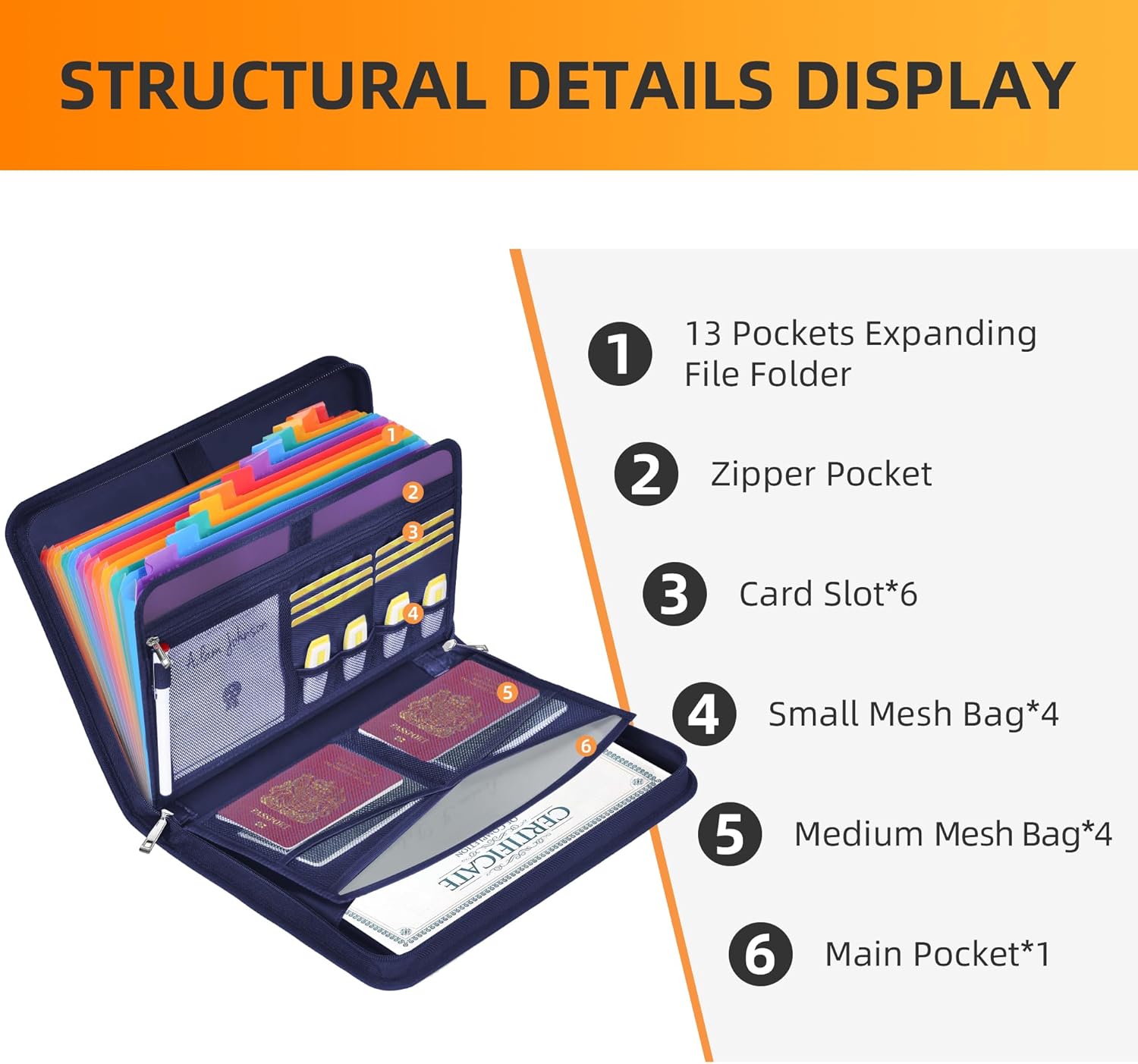 • EXPANSIVE CAPACITY: Discover the ease of JUNDUN's Accordion Document Organizer. Boasting 13 pockets, 1 zip pocket, 1 pen and 6 card slots, along with 4 small and 4 medium mesh bags – all thoughtfully fitted into a streamlined 13.97"x10.43"x1.96" frame. Securely house essential documents and belongings while effortlessly categorizing and swiftly accessing your files