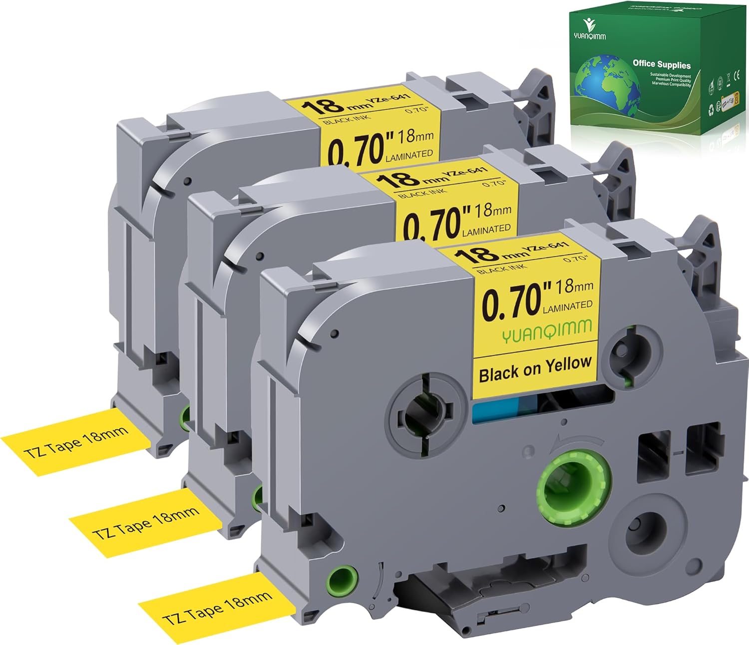 TZe-641 18mm TZe TZ Yellow Tape Compatible with Brother P Touch Label Maker Tape TZ-641 TZe641 TZ641 Label Tape 18mm 0.7 Laminated Black on Yellow for PT-D400AD PT-D610BT Printer, 3-Pack