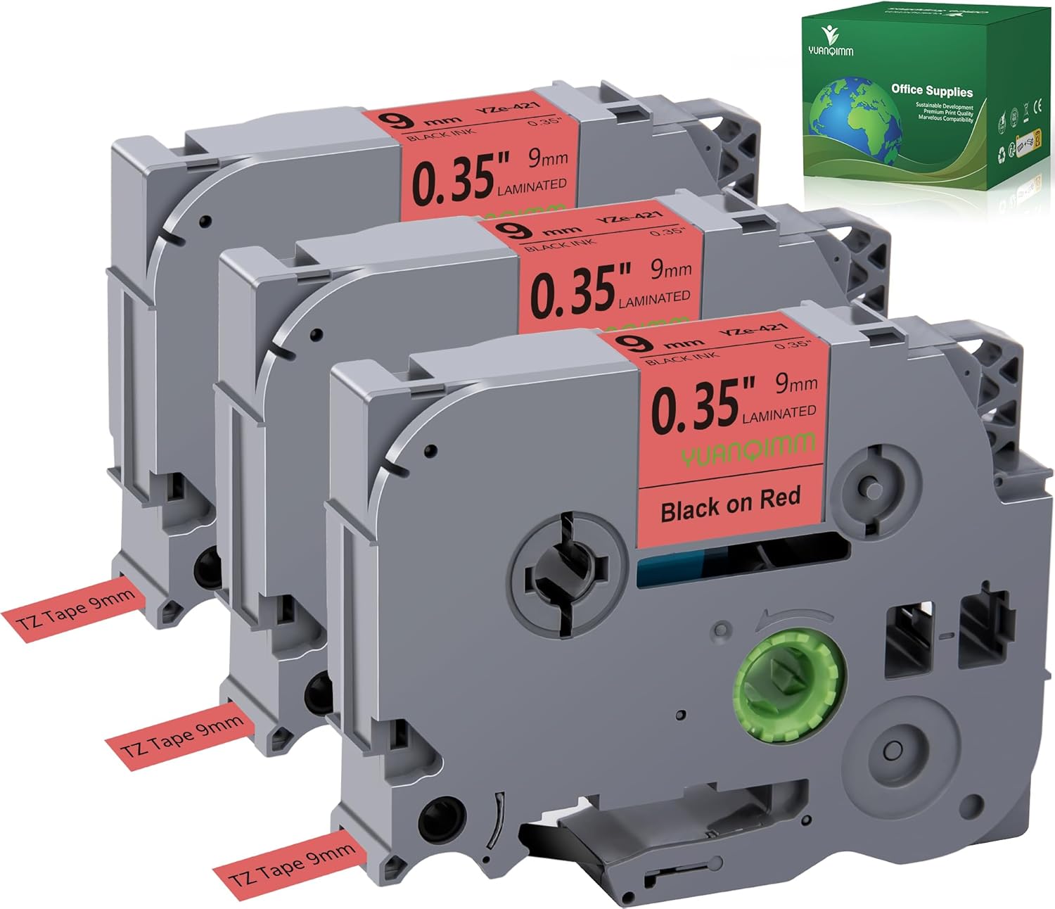 TZe-421 TZe 9mm Red TZ Tape Compatible with Brother PTouch TZ-421 TZe421 TZ421 Label Tape 9mm 0.35 Laminated Black on Red Label Maker Tape for PT D210 D200 H110 1880, 3-Pack