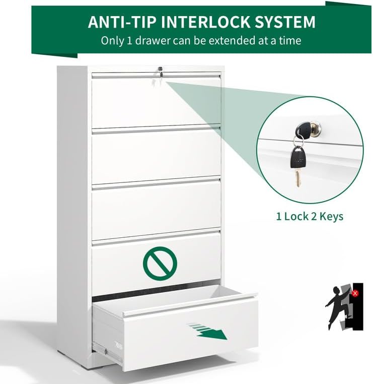 • 【Locking Cabinet for Security】This 5 drawer file cabinet with lock has an anti-tip design, which ensures that only one drawer can be opened at a time, preventing tipping and protecting your safety. The upgraded interlock system with 1 lock and 2 keys keeps your important documents safe.