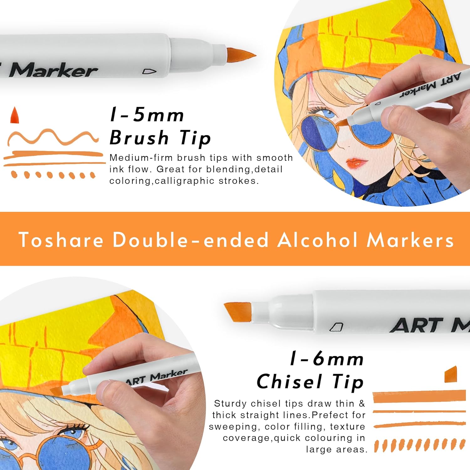 • [ Brush & Chisel Double Tip Alcohol Art Markers ] - Each brush tip marker has a double-ended design, providing great versatility. You can choose the brush tip for sweeping, details, calligraphic strokes or the broad chisel tip for quickly color in large areas.Toshare alcohol brush markers are more durable and do not fray easily.Double-Tip, Double The Fun!