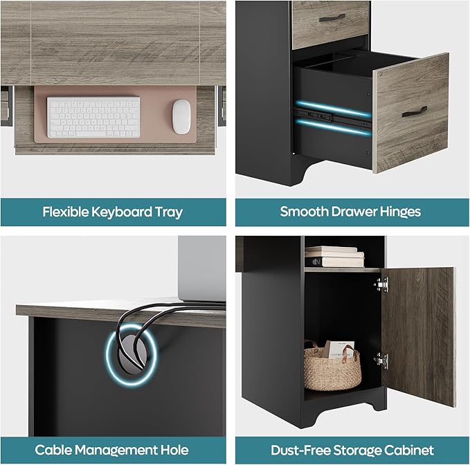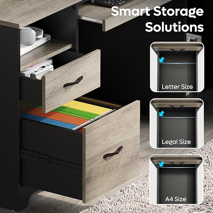 • Versatile Storage: This large desk features 2 open storage compartments, a storage drawer, a file drawer for letter/A4/legal-size hanging file folders, and a dust-free storage cabinet, offering a variety of storage options to keep your workspace organized and your essentials dust-free