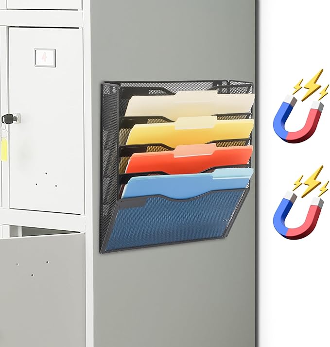 EASEPRES Magnetic 5 Pocket Mesh Hanging File Organizer, Wall Mounted Mail Paper Document Folder Holder, Clipboard Storage Organization Magazine Rack with Nametag Label for Office Home School, Black