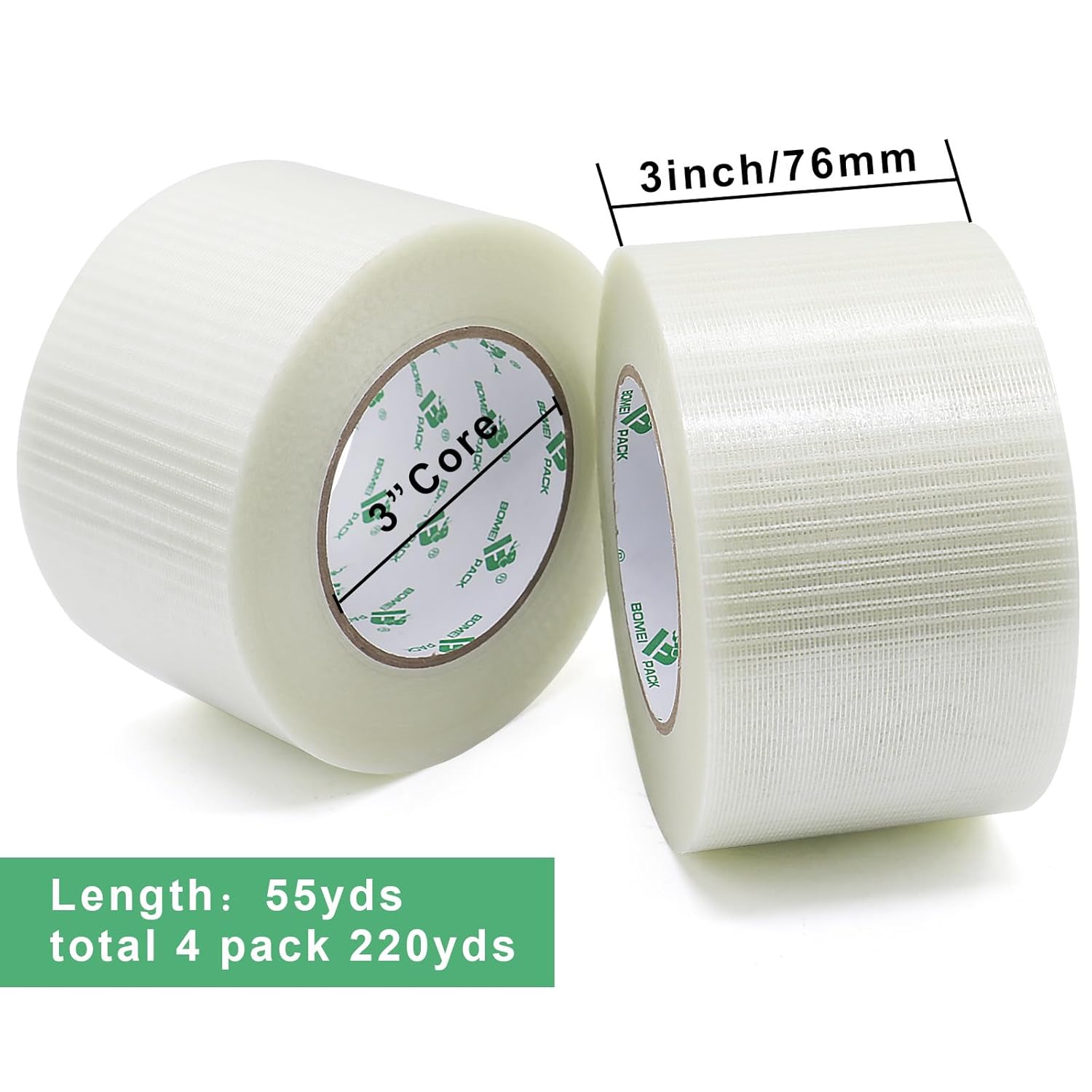 BOMEI PACK Fiber Reinforced Packing Tape 3 inch, Wide Clear Heavy Duty Bi Directional Filament Strapping Tape 3Inch x 55yds 6.7Mil, Total 4Rolls 220yds