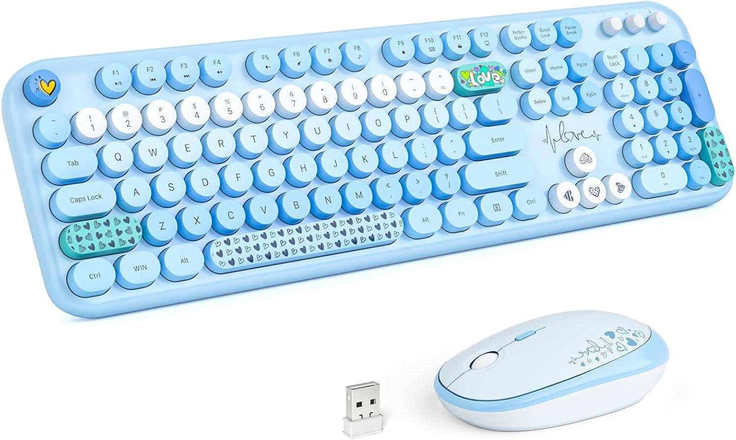 MOFII Wireless Keyboard and Mouse Combo, Full Size 2.4G Plug and Play Typewriter Retro Round Computer Keyboard and Mouse Set for Windows, Computer, Desktop, PC, Notebook - (Blue Colorful)