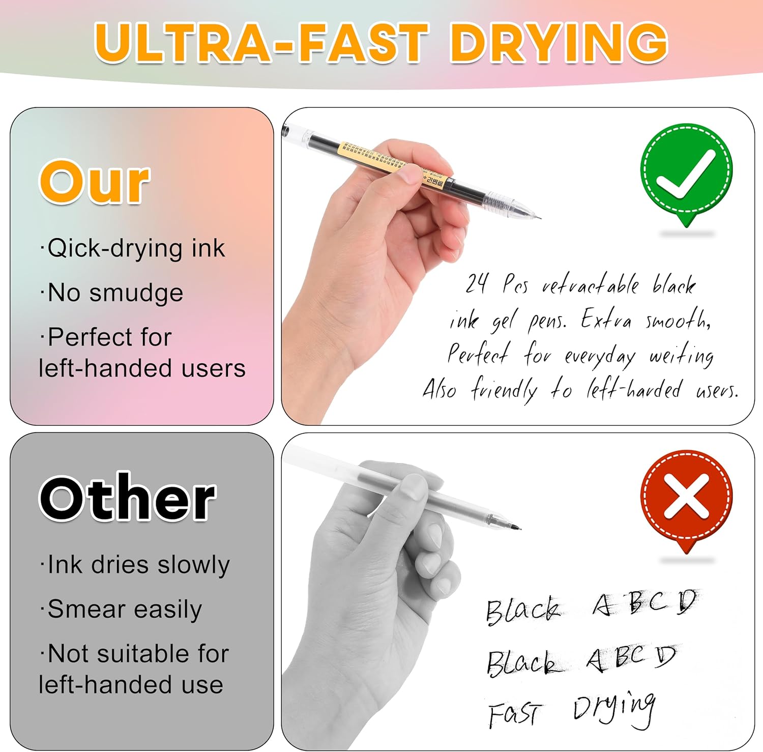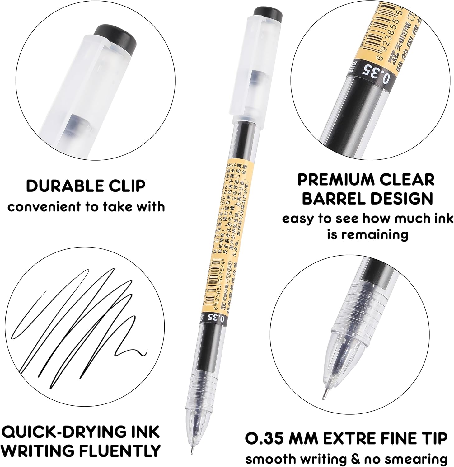 • Fine Writing Experience:This set of 12 bulk, 0.35 mm thin lined black gel pens with ultra fine point pen offers smooth writing, similar to premium rollerball pens. Ideal for bullet journaling, art projects, and office/school note taking, great for calligraphy lovers and journaling enthusiasts, ensuring neat lines.