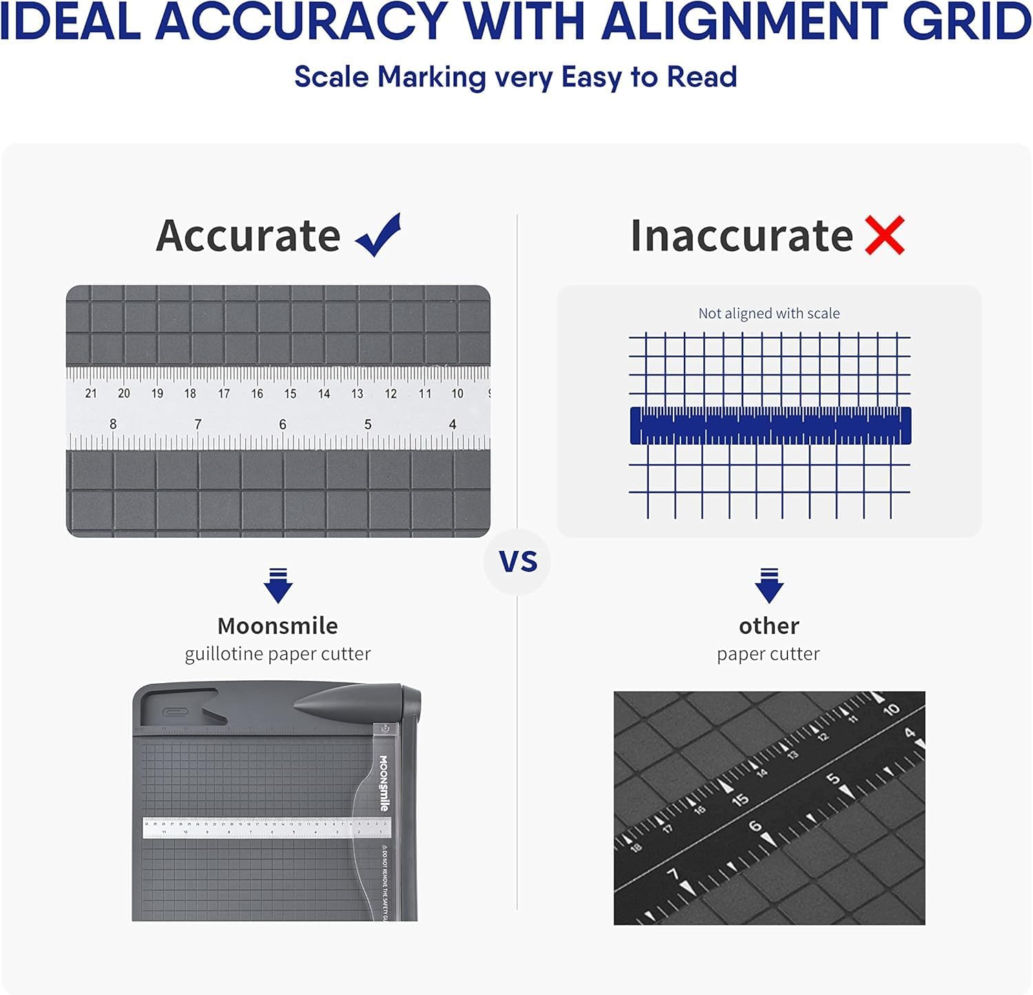 • Accuracy: A masterpiece of design with great cutting capacity; fadeless gridlines and rulers are precisely printed with dual scale (in cm and inch) for reliable alignment and perfect trimming; a sturdy 12" x 9" base and six anti-slip rubber feet ensure stable cutting on flat and hard platforms