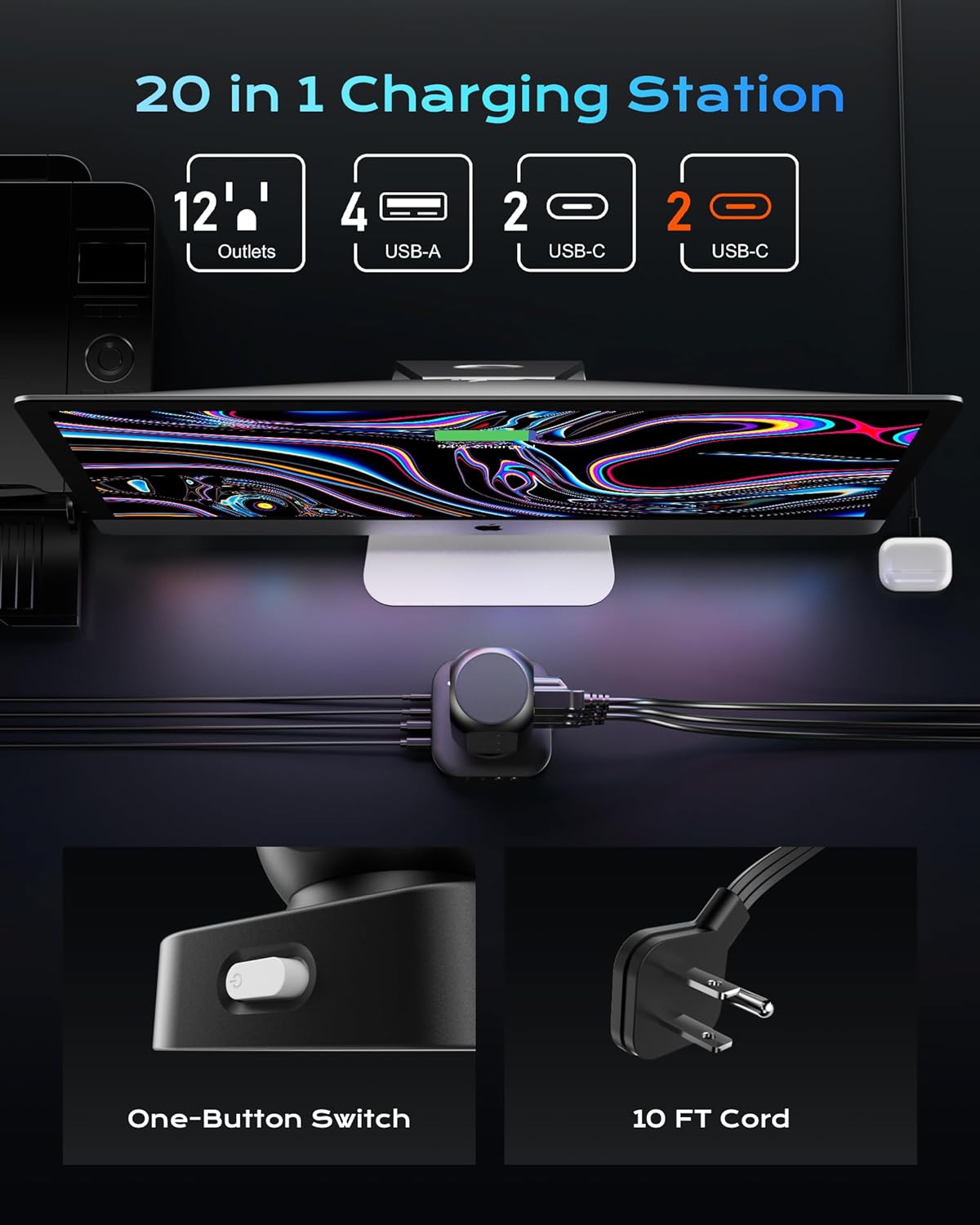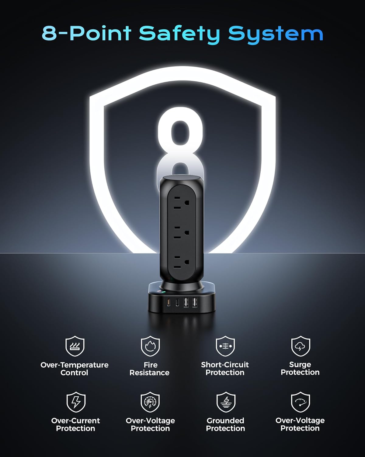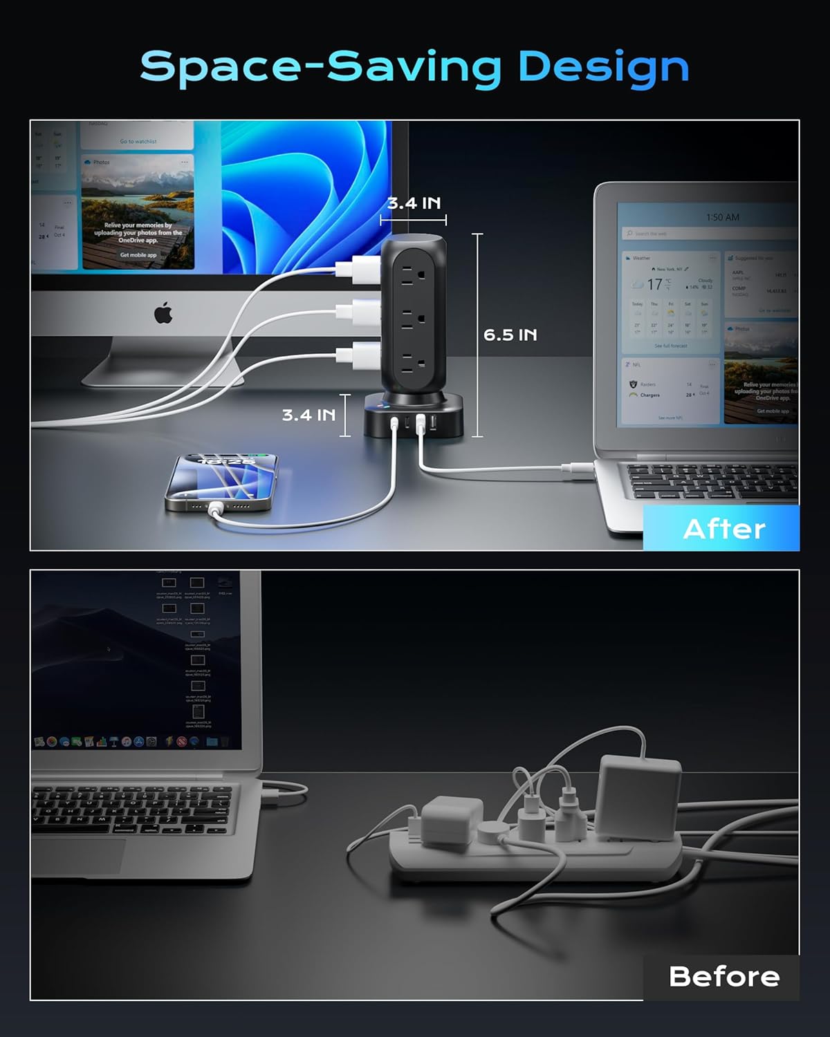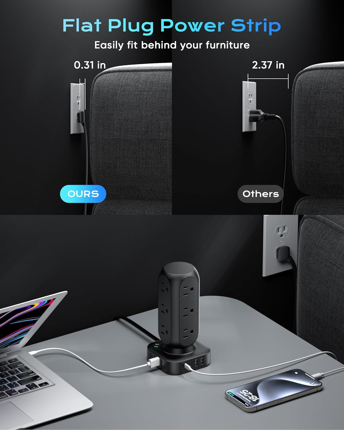 • 【20 IN 1 Power Strip Tower with USB】- This vertical power strip with USB ports features 12 AC outlets and 8 smart-charging USB ports(2 PD 20W USB-C).It can charge 20 devices simultaneously without blocking, keep your desktop organized, widely use in home/office/dorm room. (Note: Please do not exceed the rated power 1875W ).