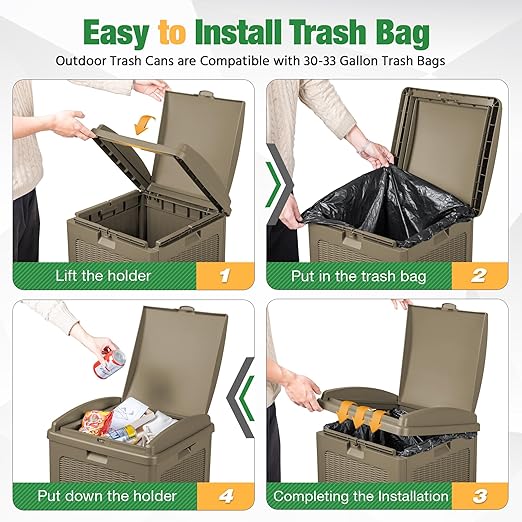 • Easy to Install Trash Bags: The waste bin for outdoors is compatible with 30-33 gallon trash bags. You need to lift the trash bag holder, put on the trash bag, put down the holder, and then finish the installation. After opening the inner lid, the garbage bag can be stably fixed in the card slot.