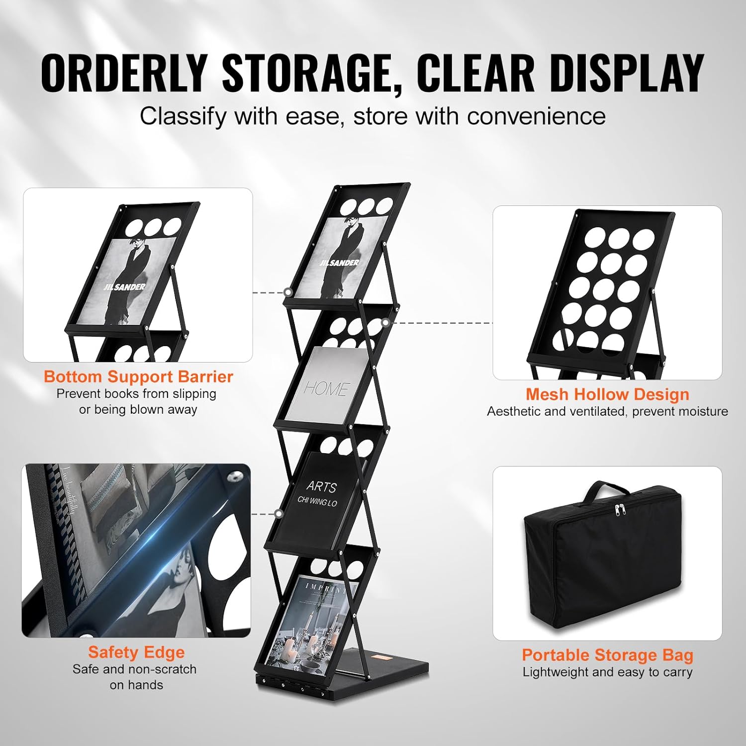 VEVOR Foldable Magazine Display Rack, 4-Tier Brochure Literature Display Stand, Portable Catalog Brochure Holder Stand with Carrying Bag for Office Trade Show Exhibitions, 4 Pockets
