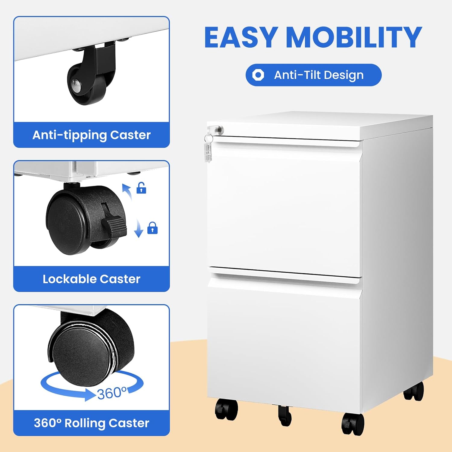 • 【Mobile File Cabinet 】: Equipped with 2 lockable casters + 2 x 360° swivel casters + 1x anti-tilt wheel, you can move this filing cabinet easily. 360° swivel casters go to any direction easily, while lockable casters offer braking and the center support wheel prevents tipping.