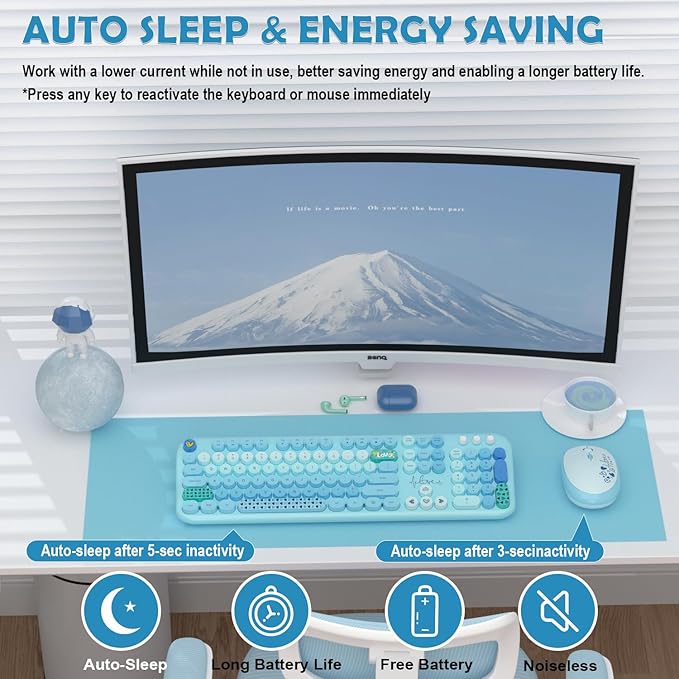 • Retro Floating Round Keycaps: Colorful keyboard and mouse wireless with vintage typewriter-inspired retro floating rounded keycaps, gives you the most comfortable typing experience and adds some much needed spunk to your desk; the crisp key sound takes you back to the industrial era, and the independent round keycaps facilitate finger positioning; the floating keys under your fingertips are comfortable and skin-friendly