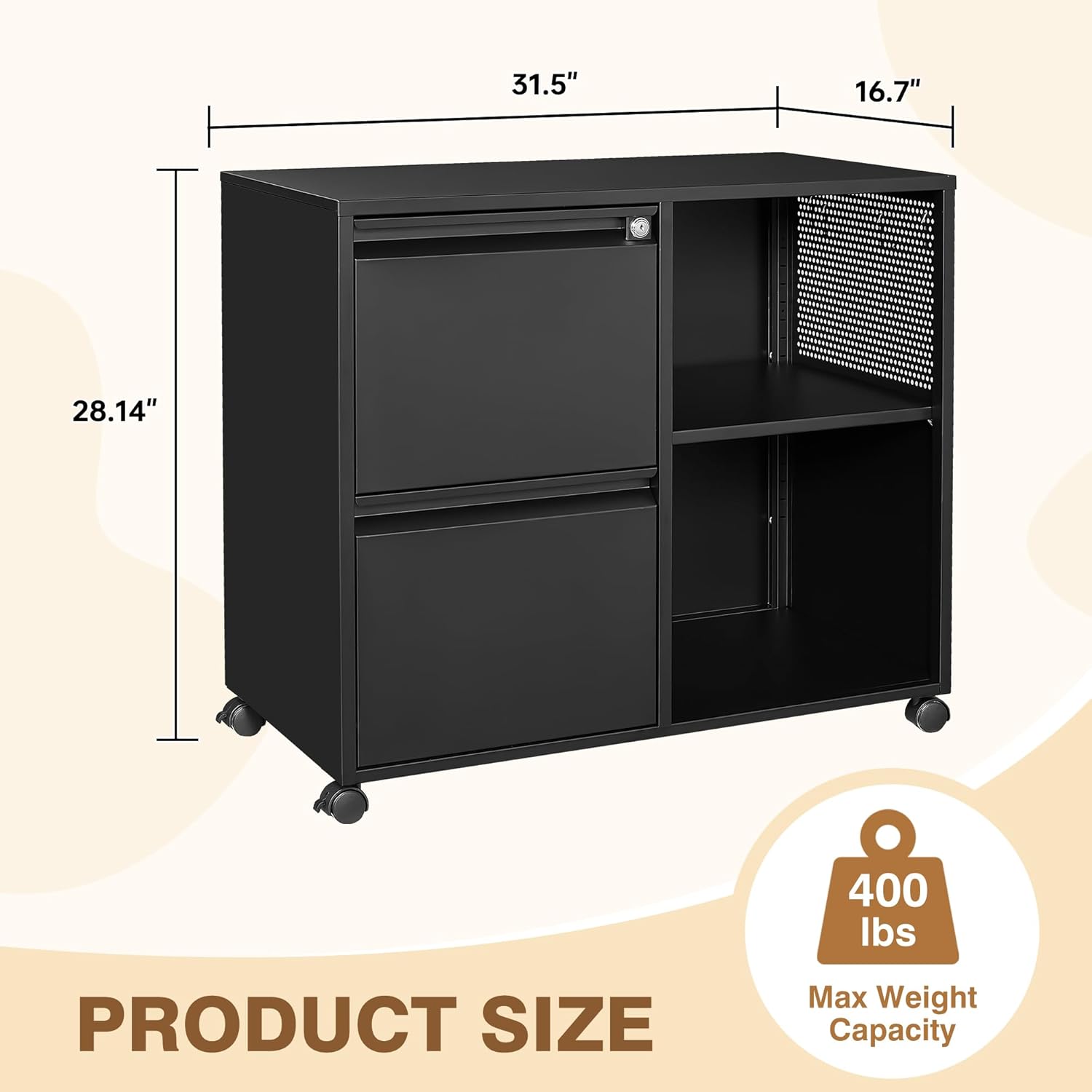 Lateral 2 Drawer Filing Cabinet with Lock, Mobile File Cabinet on Wheels, Printer Stand with Storage for Legal/Letter/A4 File Folders (Blcak)