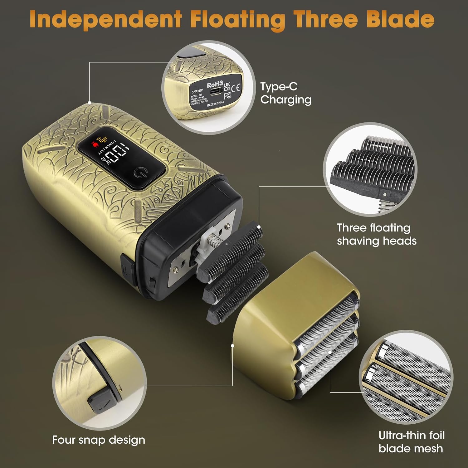 • Classic Men's Foil Blade Shaver: The electric shavers is equipped with intelligent three floating shaving heads for a close shave on the neck, face and hairline. Professionally designed ultra-thin hypoallergenic titanium foil for a bump-free, ultra-close shave for zero finishes, ideal for even the most sensitive skin. The design of three independent floating blade nets increases the contact area and the shaving efficiency is higher.