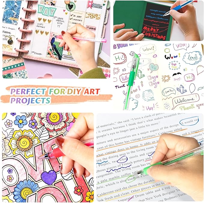 • With acid-free and non-toxic ink, our sparkly gel pens allow you to enjoy when Coloring Books, School Projects, Party Invites, Greeting Cards, Doodling, Letters to Friends