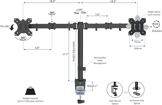 • Standing Desk Converter Bundle includes 40" desk riser (R DADRB-40-ACUSB) and Dual Monitor Arm (R DM2) for easy ergonomic positioning of 13"-27" flat panel monitors to optimize viewing comfort. R DM2 includes a grommet mount to install.