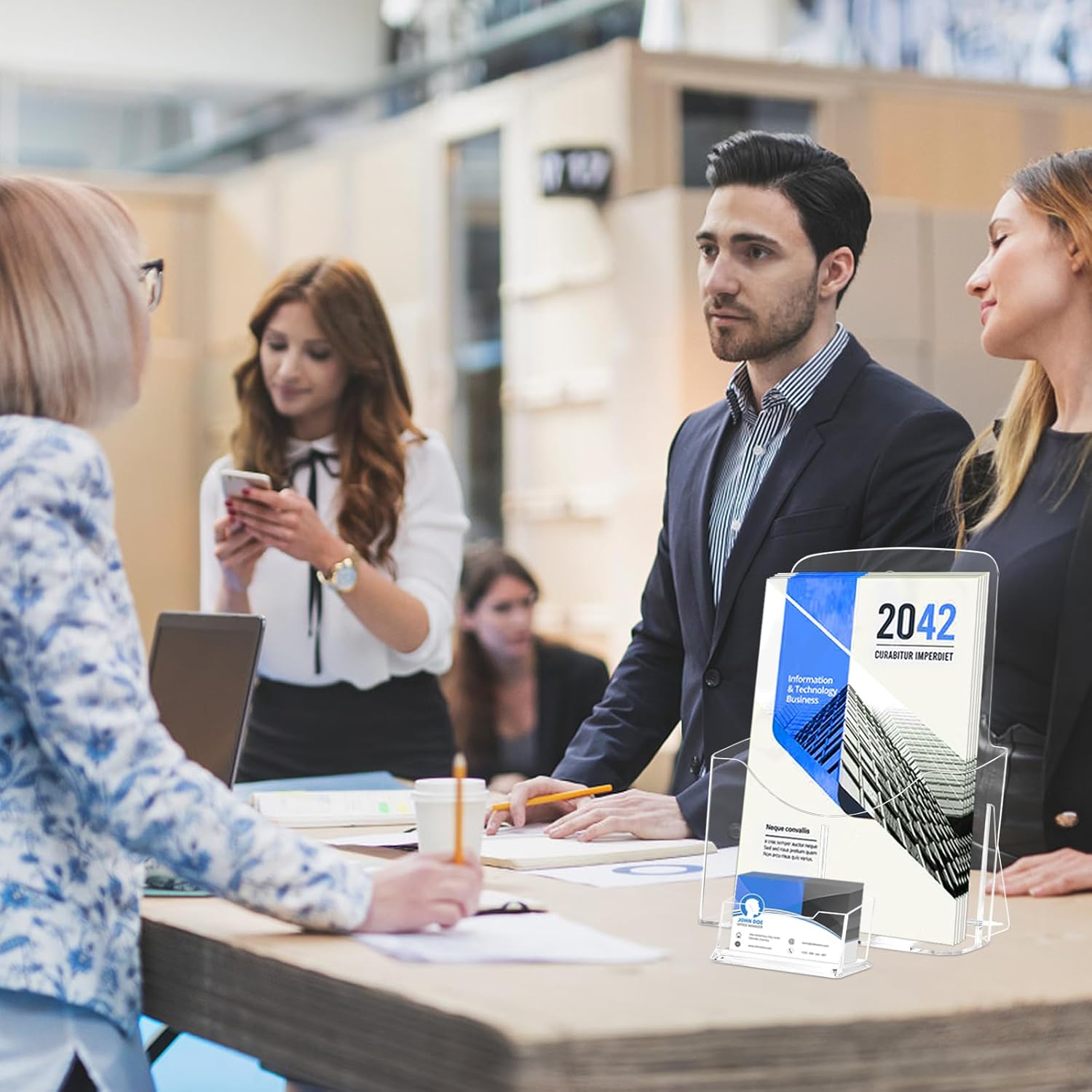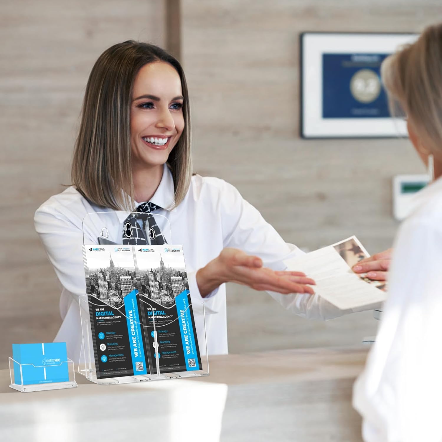 • 【1 Tier Flyer Holder】2 Pack acrylic brochure holder +2 Pack business card holder is ideal configuration for a brochure, pamphlet, and one sheet display stand for education, information, marketing, and sales