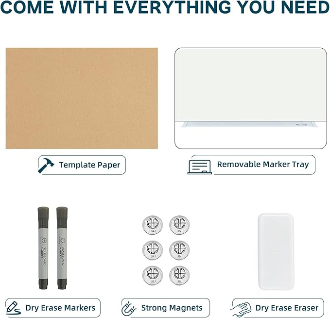 • 【ACCESSORIES INCLUDED】: 4 dry erase markers, 6 magnets, 1 glass whiteboard eraser, 1 removable aluminum marker tray. One-stop shopping. t's a great gift idea for your workmate, boss or spouse which can enhance the office/ house atmosphere