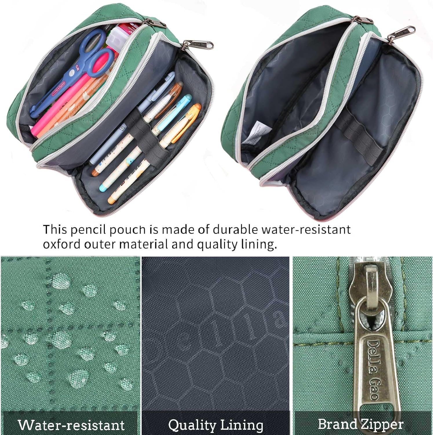 • Quality Material & Accessories:The dark green pencil case is made of hard-wearing lightweight polyester material, it's water-resisitant, tear-resisitant and washable.But you cannot put it in water, because the zipper are not waterproof.The brand metal zipper puller and smooth zipper provide longer service life. Attention:Case only, pencils not included