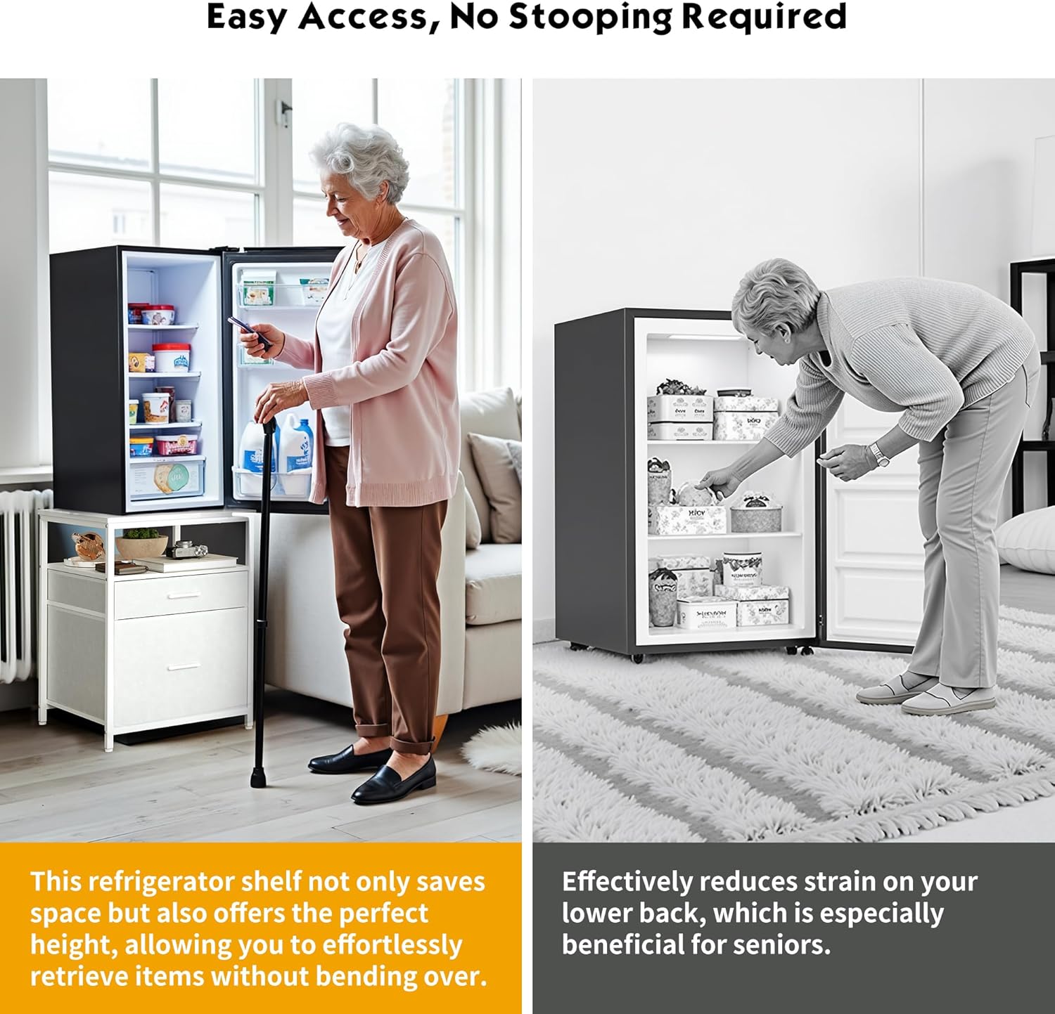 • Grab Items with Ease - This mini fridge stand is designed to reduce strain on your back and lower back, making it especially suitable for seniors. By elevating your fridge, you'll no longer need to bend over frequently to access items, making everyday use more comfortable and convenient.