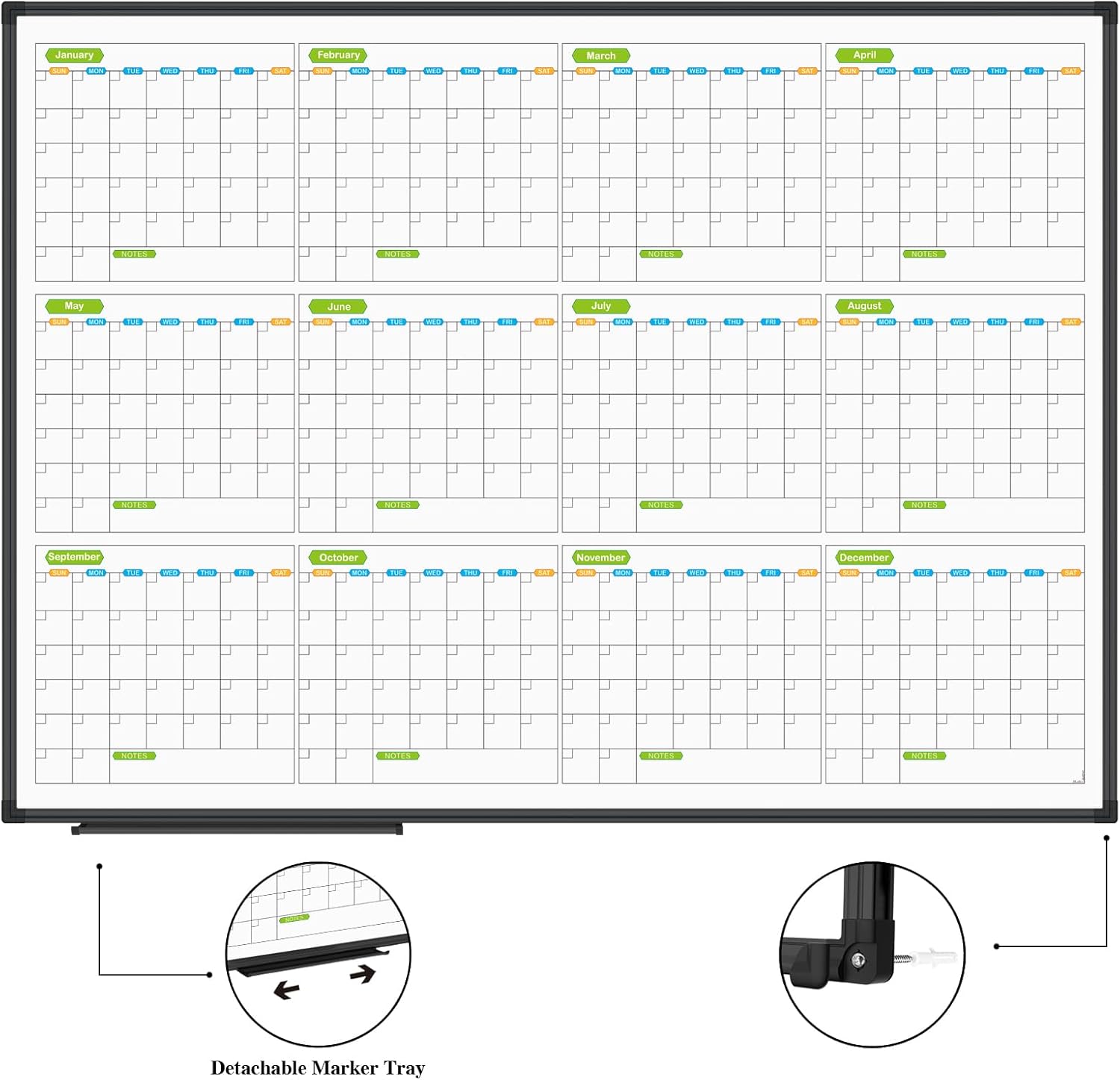 • MAGNETIC CALENDAR WHITEBOARD SURFACE: 12 months design make your plan look clearer and record things in these twelve months in more detail, surface can be used to mark dates meetings and appointments, Organize weekly plan, never forget important calendar, Strong magnetic performance, easy to put notes, pages, documents, photos, graphs and cards on. Creating more working, learning and playing experience.